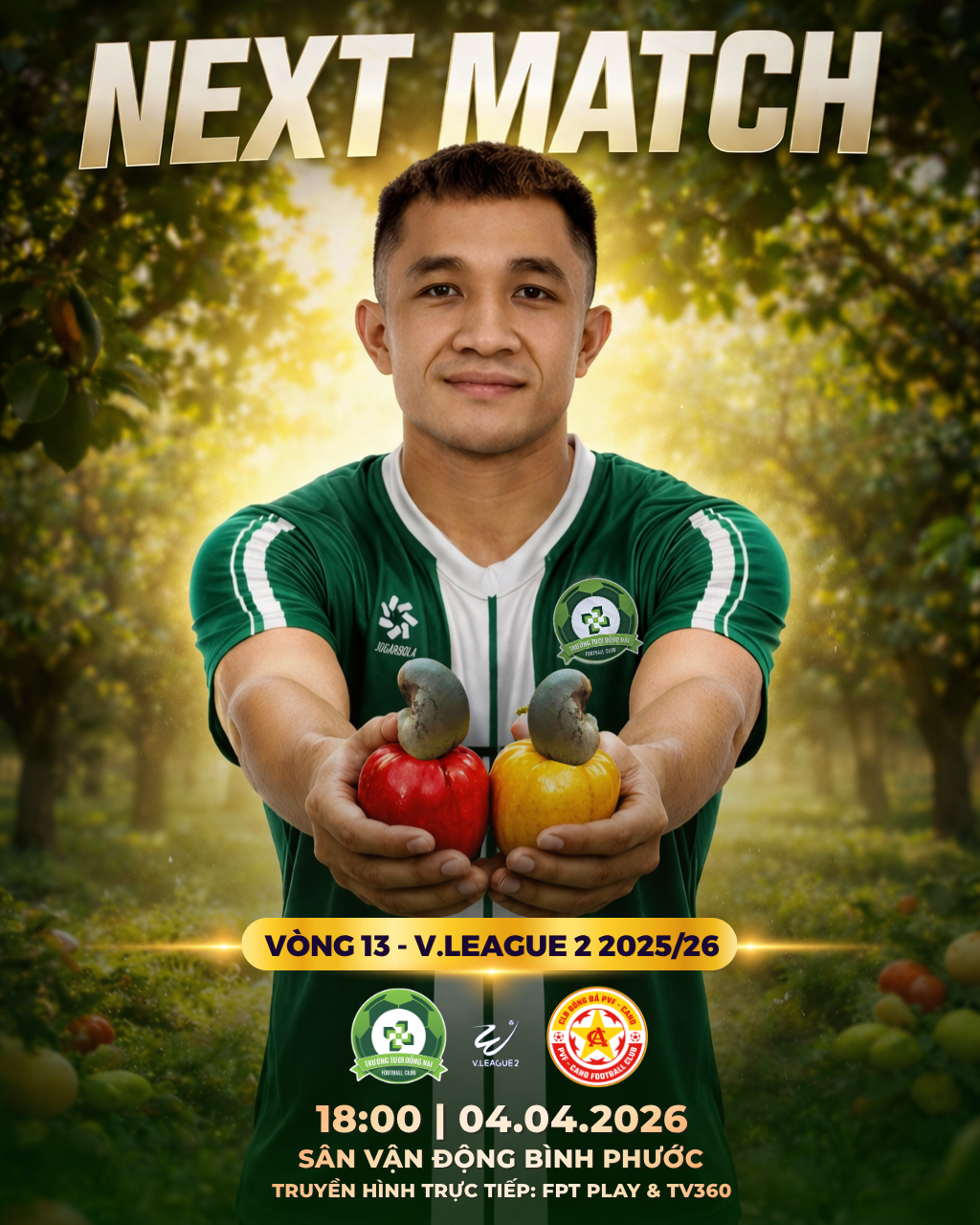 Sau quãng thời gian thi đấu giao hữu tích cực, Trường Tươi Đồng Nai FC chính thức trở lại đấu trường V.League 2 2025/26 với tâm thế của đội bóng đang dẫn đầu bảng xếp hạng. Ở vòng 13, đội bóng áo xanh sẽ có cuộc tiếp đón Trẻ PVF-CAND trên sân nhà Bình Phước vào lúc 18h00 ngày 04.04.2026.